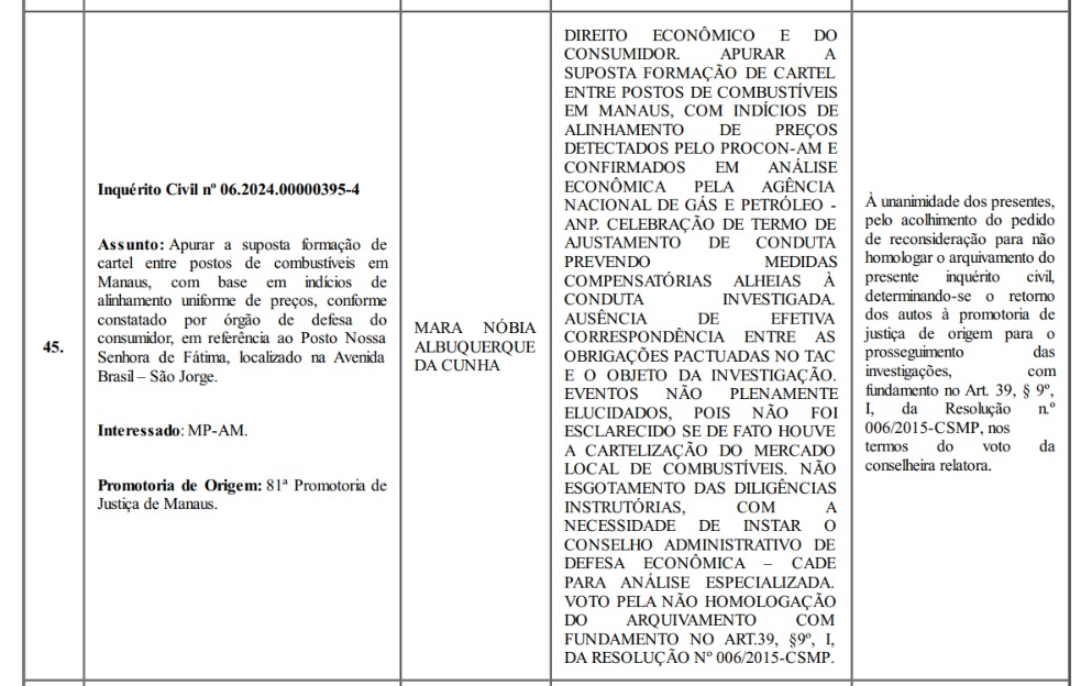 O Conselho Superior do Ministério Público do Amazonas (CSMP) decidiu, por unanimidade, rejeitar o pedido de arquivamento do Inquérito Civil nº 06.2024.00000395-4, que apura a suposta formação de cartel entre postos de combustíveis em Manaus. O procedimento investigativo tem como ponto de partida indícios de alinhamento uniforme de preços, identificados inicialmente pelo Procon-AM e confirmados por análise econômica da Agência Nacional de Petróleo, Gás Natural e Biocombustíveis (ANP).