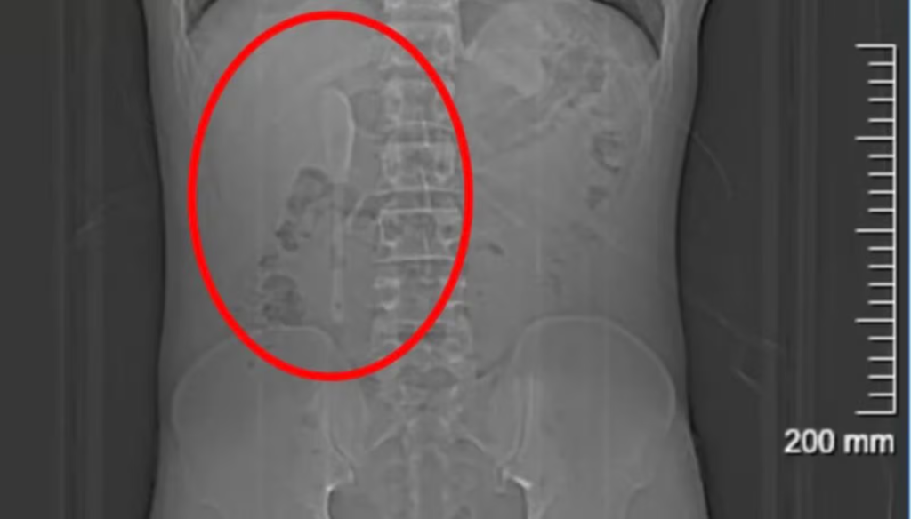 Mesmo com a colher dentro do corpo, ele seguiu com sua rotina normalmente pelos cinco meses seguintes, sem apresentar sintomas significativos. Só procurou ajuda médica em junho, após suspeitar que havia engolido plástico ao comer comida de delivery. Foi então que exames revelaram o verdadeiro problema: uma colher de 15 centímetros presa em uma posição delicada no intestino.