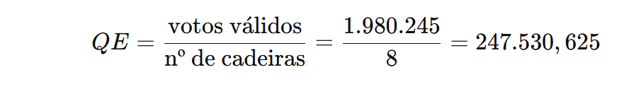 2.750.340 eleitores × 72% = 1.980.245 votos válidos / 8 = 247.530,625