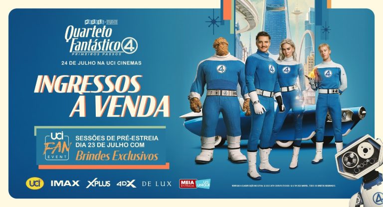 Manaus (AM) – Os fãs do Universo Cinematográfico da Marvel já podem se preparar: a rede UCI anunciou a pré-venda de ingressos para o aguardado reboot de Quarteto Fantástico, que estreia com sessões antecipadas a partir do dia 23 de julho. O lançamento oficial acontece no dia seguinte, 24 de julho, com exibições em todas as salas especiais da rede — IMAX, 4DX, XPLUS e DE LUX.