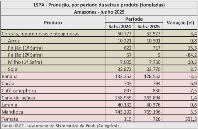 O relatório detalha as estimativas de produção para diversos produtos, oferecendo um termômetro da dinâmica agrícola amazonense. Os dados são do Levantamento Sistemático da Produção Agrícola (LSPA), divulgado nesta quarta-feira (10) pelo Instituto Brasileiro de Geografia e Estatística (IBGE).