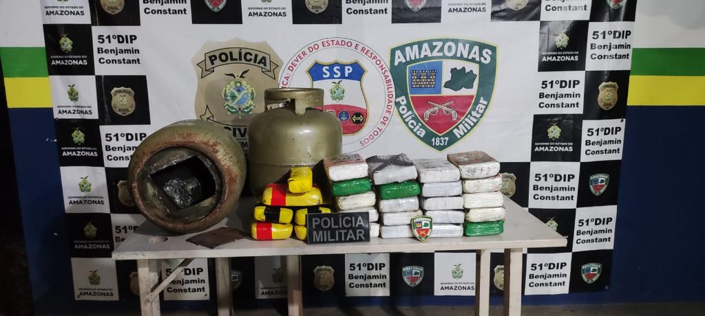 No porto de Benjamin Constant, a 1.121 quilômetros de Manaus, policiais da 2ª Companhia prenderam dois homens, de 19 e 26 anos, após denúncia repassada pelo secretário municipal. Com apoio do cão farejador Hulk, as equipes localizaram 23,610 quilos de cocaína e 5,65 quilos de pasta base de cocaína escondidos em fundo falso de botijas de gás que chegaram de Tabatinga.