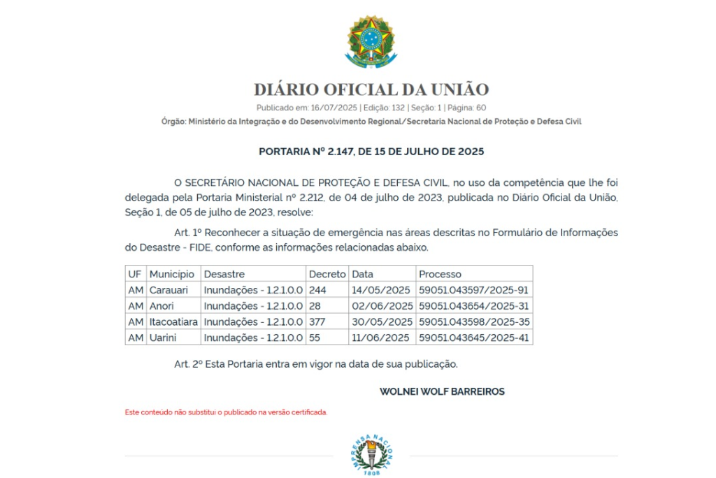As portarias com os reconhecimentos foram publicadas no Diário Oficial da União (DOU). No caso dos municípios amazonenses, o cenário de inundações exige atenção redobrada, dada a extensão territorial e os desafios logísticos enfrentados pelas comunidades ribeirinhas e isoladas.