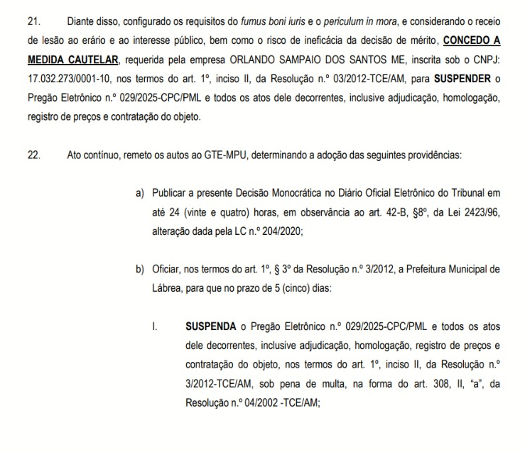 O Tribunal de Contas do Estado do Amazonas (TCE-AM) determinou a suspensão imediata do Pregão Eletrônico nº 029/2025-CPC/PML, promovido pela Prefeitura de Lábrea (distante 852 quilômetros de Manaus), destinado à contratação de serviços de manutenção de equipamentos de refrigeração para o Hospital Regional da cidade.