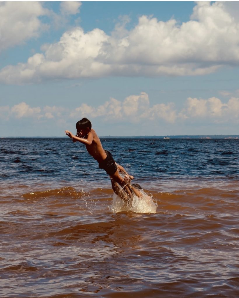 Já a artista Gabriella Mescarello, nascida e criada em Manaus, encontrou inspiração em lembranças afetivas de sua família. A obra Velha Infância é uma fotografia de duas crianças brincando no rio, na Praia da Lua.