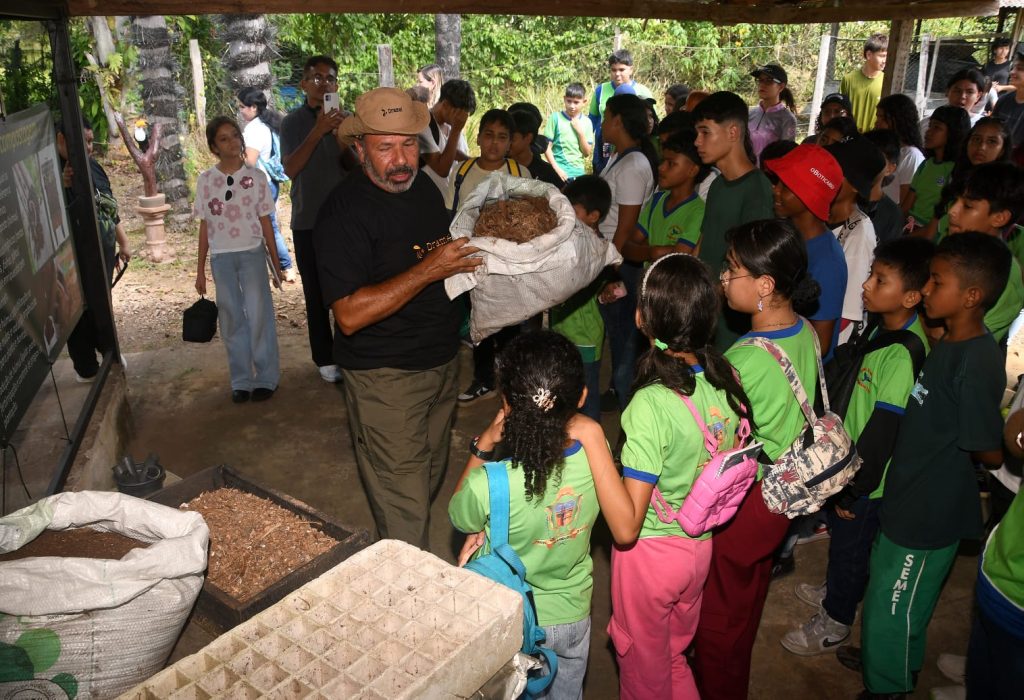 Ao longo do caminho, os estudantes conheceram viveiros de mudas, tanques com tambaquis e tartarugas amazônicas, galinheiro agroecológico e aves como as calopsitas, que, mesmo não nativas, encantaram as crianças.