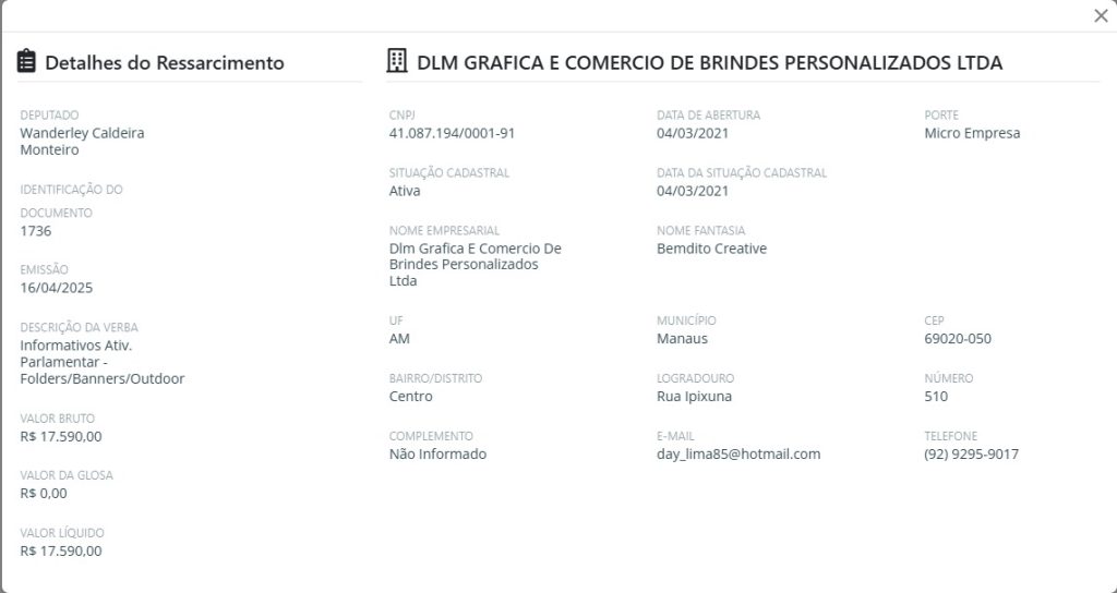 O contrato mais recorrente é com a empresa DLM Gráfica e Comércio de Brindes Personalizados LTDA, responsável pela produção de folders, banners e outdoors — materiais que, em tese, deveriam divulgar as ações do mandato de Monteiro.