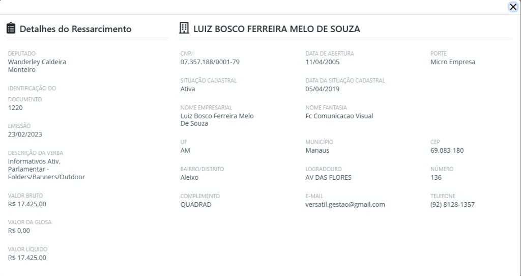 Os pagamentos à gráfica tiveram início em fevereiro de 2023, quando a empresa passou a receber R$ 17.425 mensais para a divulgação da atividade parlamentar, valor que subiu para R$ 17.550 até dezembro daquele ano. No total, foram pagos R$ 139.815 ao proprietário. Além disso, a gráfica, de propriedade de Luiz Bosco Ferreira Melo de Souza, também forneceu material de expediente ao gabinete do parlamentar, somando R$ 35,5 mil no período.