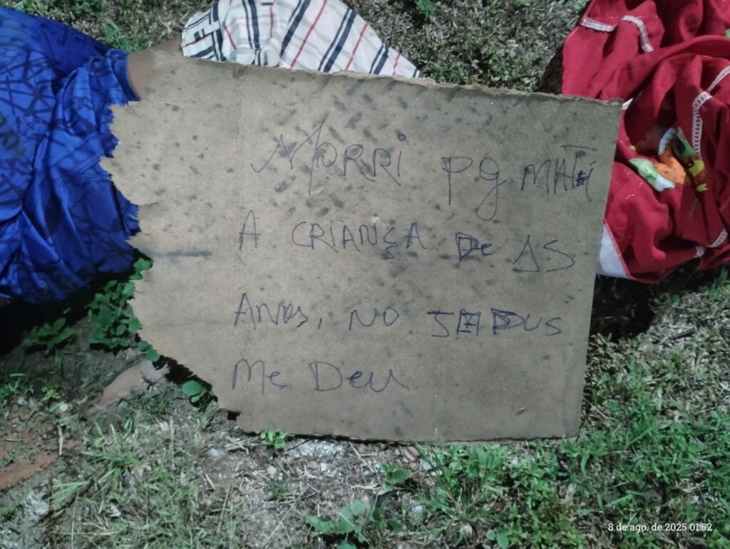 Um homem ainda não identificado foi encontrado morto, com sinais de violência, na rua Sucupira, no bairro Terra Nova, Zona Norte de Manaus, durante a madrugada desta sexta-feira (8). Ao lado do corpo, havia um bilhete com a seguinte mensagem: “Morri porque matei a criança de 15 anos no Jesus de Deus”.