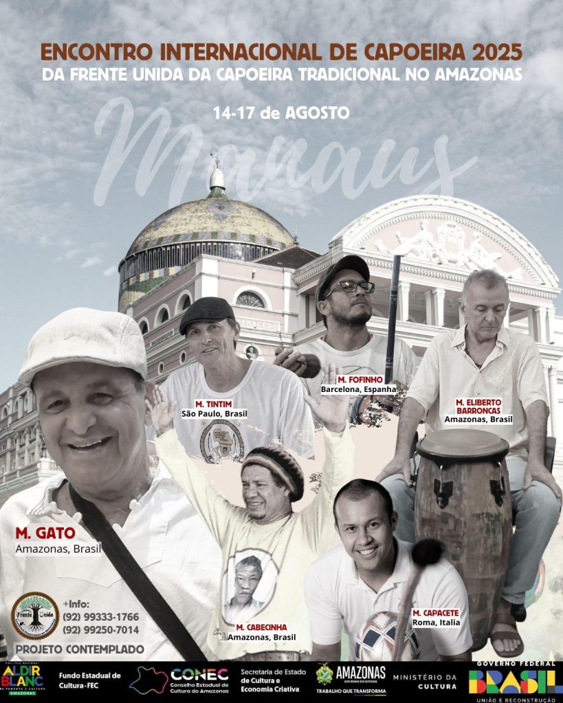 O Encontro Internacional de Capoeira Tradicional, organizado pela Frente Unida da Capoeira Tradicional no Amazonas, acontece entre os dias 14 e 17 de agosto em Manaus. O evento gratuito reúne mestres renomados do Brasil e do exterior para fortalecer a Capoeira Tradicional no estado por meio de oficinas, rodas e apresentações culturais.