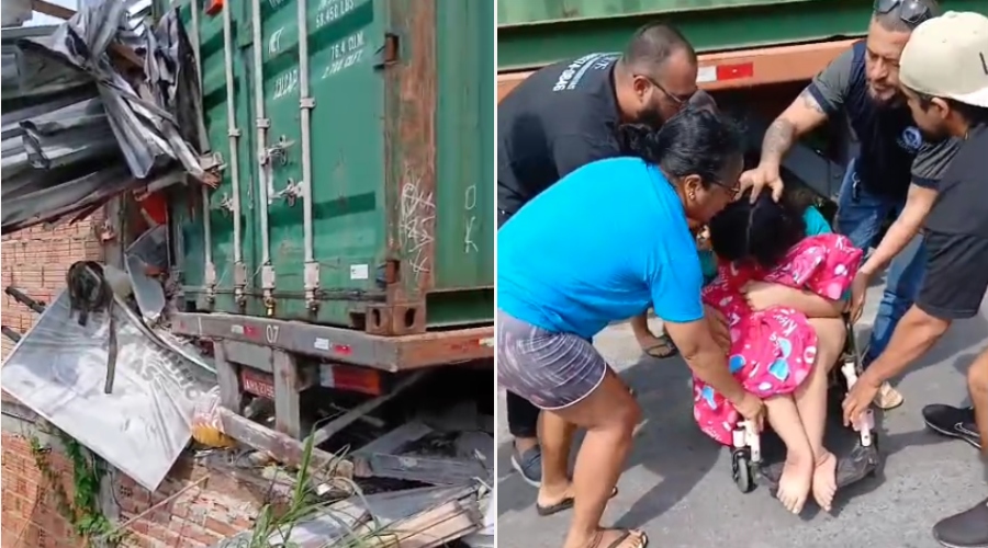 🚚 Uma carreta desgovernada invadiu uma casa na manhã desta segunda-feira (11), na comunidade Boas Novas, bairro Cidade Nova, em Manaus, e deixou uma cadeirante presa sob um contêiner. pic.twitter.com/ibtaIjR2Ob