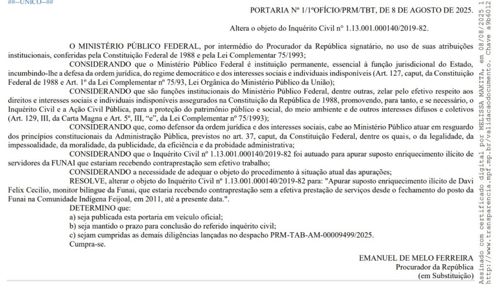 O Ministério Público Federal no Amazonas (MPF) instaurou um inquérito civil, nesta segunda-feira (11), para investigar a suspeita de enriquecimento ilícito por parte do pastor Davi Félix Cecílio, que atua como monitor bilíngue da Fundação Nacional dos Povos Indígenas (Funai).