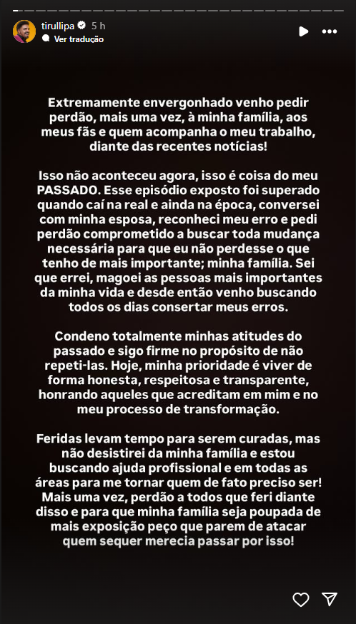 Tirullipa ainda afirmou que está recebendo ajuda profissional para lidar com as consequências e evitar novos erros.