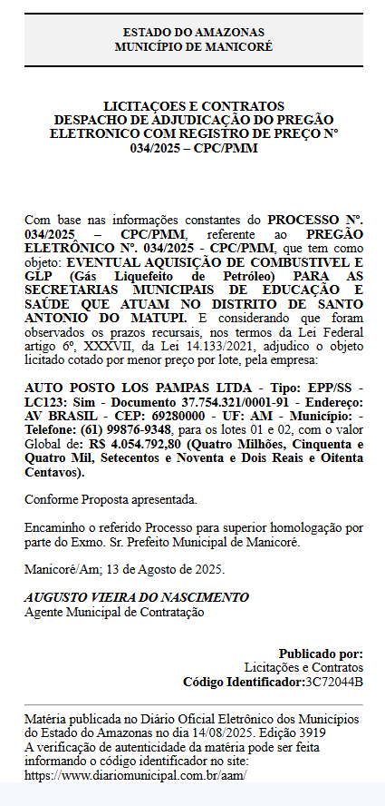 O mais recente, assinado no dia 13 de agosto e publicado nesta quinta-feira (14) no Diário Oficial da Associação Amazonense de Municípios (AAM), é de R$ 4.054.792,80 para aquisição de combustível e gás liquefeito de petróleo (GLP).