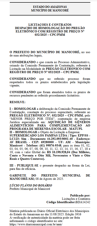 Poucos dias antes, em 8 de agosto, foi homologada a licitação para aquisição de gêneros alimentícios destinados à complementação da merenda escolar, também em Matupi. O valor global deste contrato é de R$ 10.198.928,04, também com vigência de 12 meses, vencido pela mesma empresa.