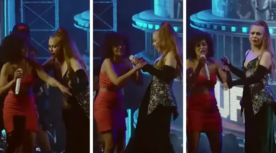 Surpresa com a situação, Joelma tentou, sorrindo, retirar o microfone das mãos da fã. Quando a mulher resistiu, a cantora contou com a ajuda de um segurança e de outra fã para conseguir tomar o microfone.