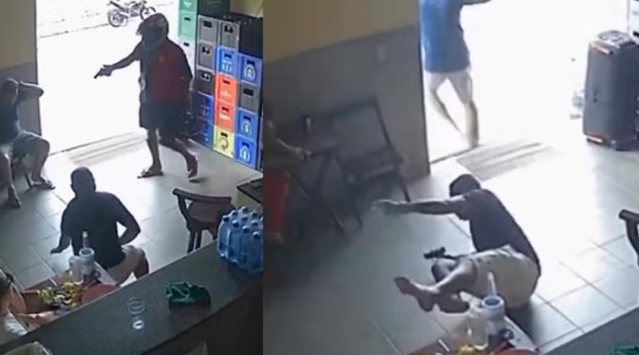 Câmeras de segurança registraram o momento em que Raimundo entra no bar usando capacete de moto e portando uma arma de fogo. Ele rende os clientes, exige objetos de valor e manda todos colocarem as mãos na cabeça.