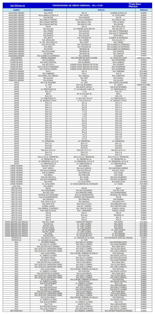 Em caso de ocorrências durante o período das obras, os clientes podem procurar as equipes de campo ou entrar em contato pelos canais oficiais da Águas de Manaus: 0800 092 0195, site aguasdemanaus.com.br e aplicativo Águas APP.