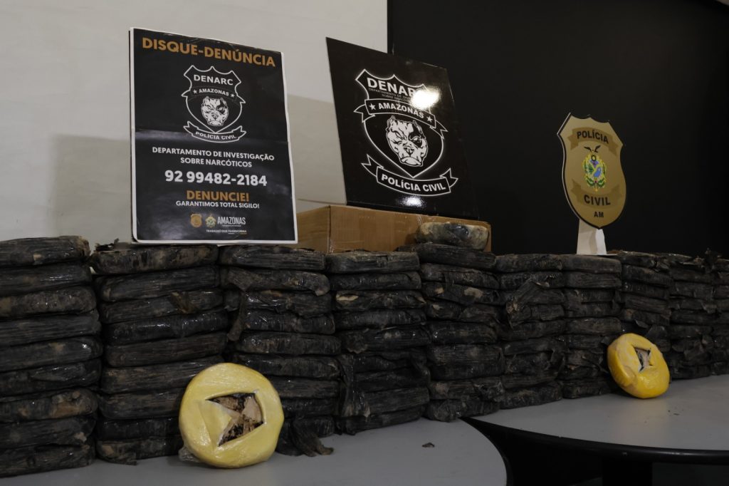 Membros de grupo criminoso responsável pela distribuição de drogas foram presos em flagrante na segunda-feira (8), durante ação do Departamento de Investigação sobre Narcóticos (Denarc). Quatro homens, com idades entre 28 e 31 anos, foram detidos no bairro Tarumã, zona oeste de Manaus, transportando 110 quilos de cocaína avaliados em R$ 8,1 milhões.