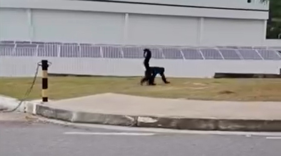 Uma motorista flagrou o momento em que o animal andava tranquilamente pela calçada e subia nas grades do centro. O vídeo viralizou nas redes sociais.