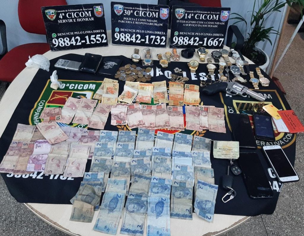 Foram apreendidos com o grupo uma motocicleta com restrição de roubo, um revólver Calibre 38, seis munições intactas, 18 relógios, três celulares, cinco cordões, sete anéis, carro Onix de placa PHH 3F17 e dinheiro no valor R$403,45.