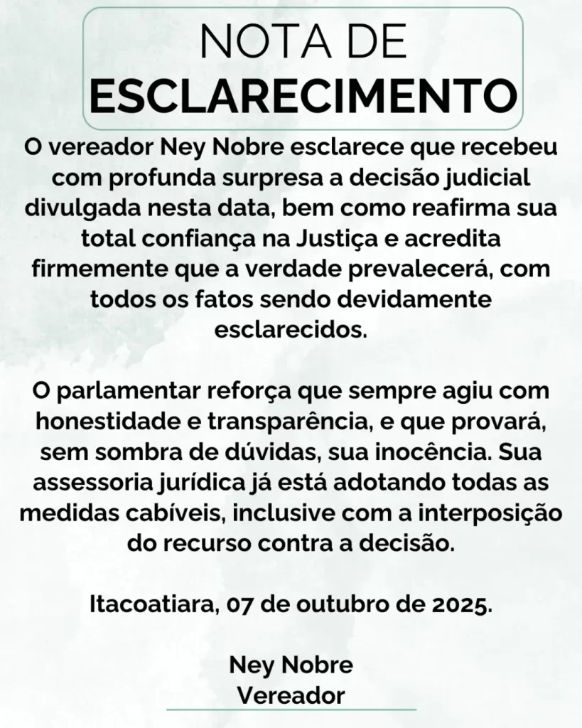 Em suas redes sociais, o vereador publicou uma nota nesta quarta-feira (8) onde afirmou que recebeu com profunda surpresa a decisão judicial e reafirma sua confiança na Justiça, acreditando que a verdade prevalecerá e que todos os fatos serão devidamente esclarecidos.
