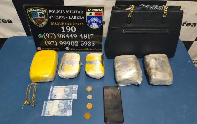 Uma mulher de 29 anos foi presa, na terça-feira (7), pela Polícia Militar do Amazonas (PMAM), ao ser flagrada transportando mais de três quilos de entorpecentes de Manaus para o município de Lábrea, localizado a 702 quilômetros da capital. A ação foi realizada por policiais da 4ª Companhia Independente de Polícia Militar (CIPM).