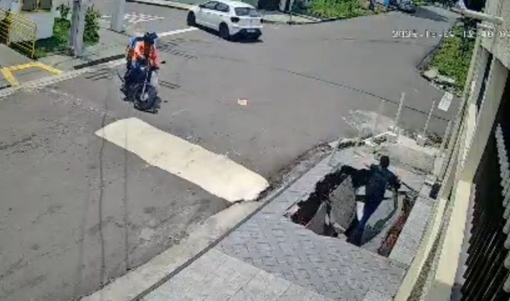 Uma câmera de segurança registrou o momento do acidente, mostrando o estudante andando tranquilamente antes da calçada ceder. O desabamento aconteceu de forma repentina, assustando quem passava pelo local.