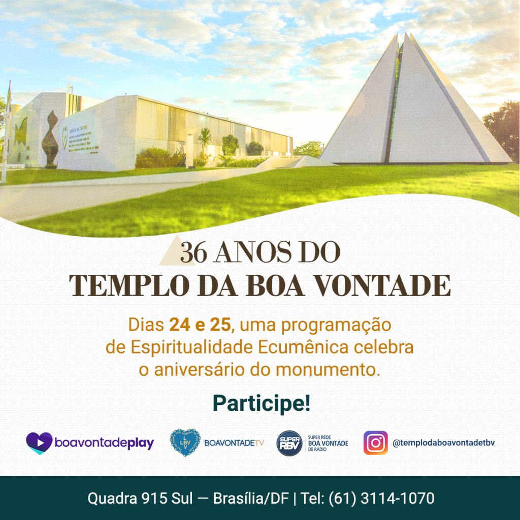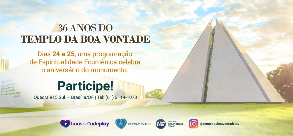 Nos dias 24 e 25 de outubro, o Templo da Boa Vontade (TBV) comemora seus 36 anos de fundação. Conhecido também como Pirâmide das Almas Benditas, o monumento convida o público a vivenciar momentos de profunda renovação espiritual, sob o tema: “A certeza da Volta do Cristo: ‘Ora vem, Senhor Jesus!’”