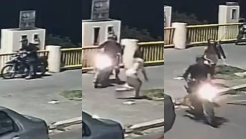Nas imagens, o homem aparece chegando em uma motocicleta, descendo a escadaria e anunciando o assalto com uma arma em mãos. Ele roubou um cordão banhado a ouro e um celular das vítimas. Durante a fuga, uma das jovens reagiu e arremessou uma ripada, atingindo o suspeito nas costas.