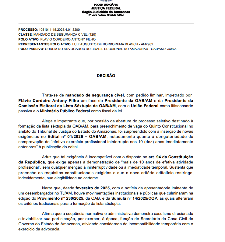 A decisão determina, ainda, a intimação imediata da OAB-AM, com prazo de 72 horas para manifestação, e prevê que o Ministério Público Federal será ouvido antes do julgamento final. O mérito do mandado de segurança definirá os limites da atuação da OAB na fixação de critérios para a lista sêxtupla.