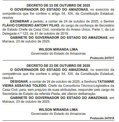 O governador Wilson Lima exonerou Flávio Antony do cargo de secretário-chefe da Casa Civil do governo do Estado. Tatiane Vieira Assayag Toledo, subsecretária, foi designada para responder pela função.