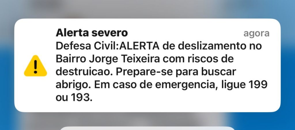 Manaus (AM) – A Defesa Civil de Manaus emitiu, na manhã desta terça-feira (11), um alerta severo de risco de deslizamento no bairro Jorge Teixeira, na zona Leste da capital. A orientação ocorre após a cidade amanhecer sob forte chuva, aumentando a possibilidade de desastres e destruição em áreas vulneráveis.