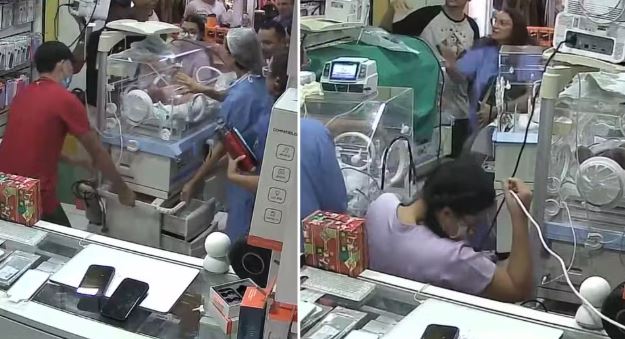 Imagens de câmeras de segurança mostram funcionárias da unidade de saúde chegando com quatro incubadoras e conectando os equipamentos à rede elétrica da loja, com a ajuda de comerciantes e populares que se mobilizaram para auxiliar no resgate.