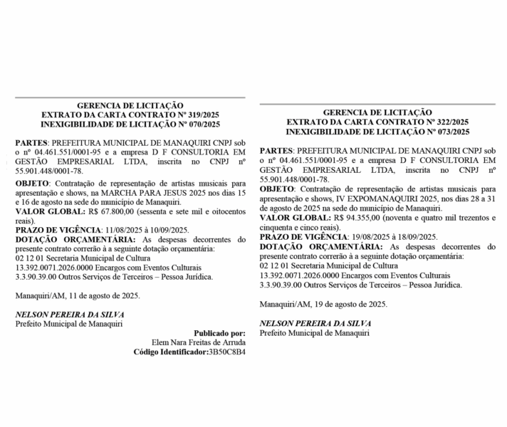 A administração municipal de Manaquiri, comandada por Nelson Nilo, acelerou entre agosto e novembro de 2025 uma série de contratações diretas para atrações musicais em eventos oficiais. Os documentos publicados no Diário Oficial apontam para um crescimento atípico de contratos por inexigibilidade, muitos deles realizados em comunidades rurais, com pouca participação do público e cifras consideradas elevadas por especialistas em gestão cultural.