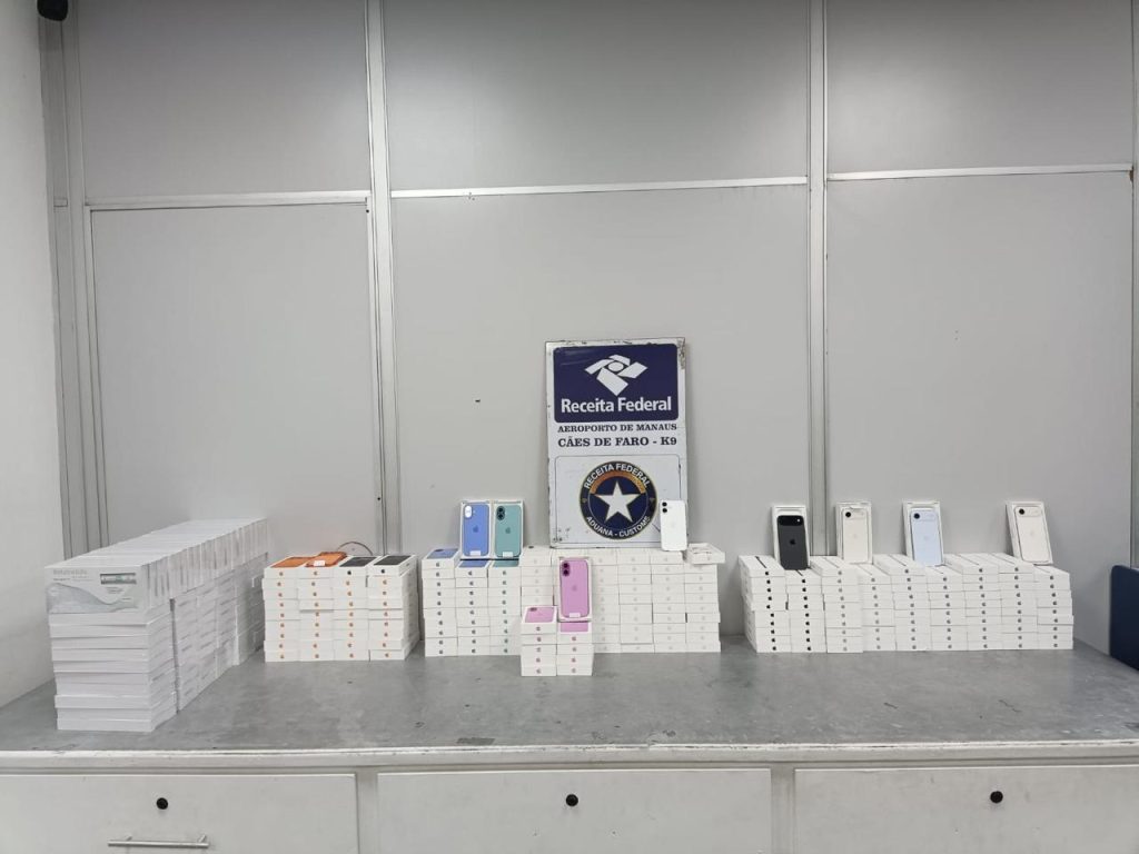 A Equipe de K9 da Receita Federal apreendeu nesta terça-feira (2), durante fiscalização aduaneira no Terminal de Carga do Aeroporto Internacional Eduardo Gomes, em Manaus, 2.000 iPhones, vários modelos de iPad, Apple Watch, mouse Magic e um grande carregamento de retatrutida, medicamento usado contra obesidade e proibido no Brasil.
