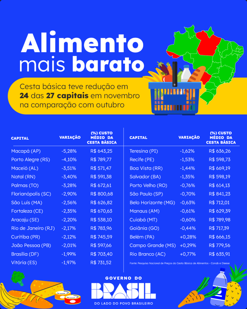 No país, o preço dos alimentos básicos caiu entre outubro e novembro em 24 das 27 capitais analisadas. As maiores reduções ocorreram em Macapá (-5,28%), Porto Alegre (-4,10%), Maceió (-3,51%), Natal (-3,40%) e Palmas (-3,28%).