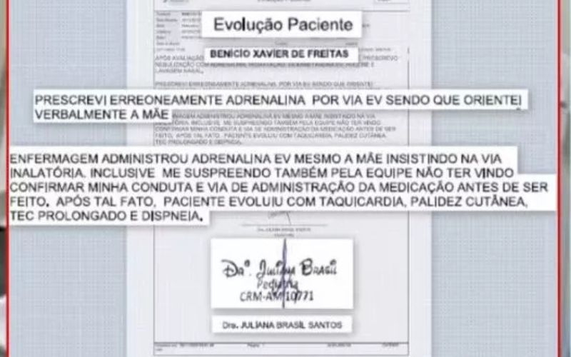 De acordo com os depoimentos colhidos pela Polícia Civil, Benício recebeu doses elevadas de adrenalina por via intravenosa, mesmo sem apresentar parada cardiorrespiratória. A medicação foi aplicada após prescrição médica assinada por Juliana Brasil.