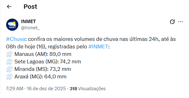 O Instituto Nacional de Meteorologia (Inmet) informou, por meio das redes sociais, que Manaus registrou 89 milímetros de chuva nas últimas 24 horas. O volume, provocado pela forte chuva que atingiu a capital amazonense na segunda-feira (15), foi o maior registrado no período.