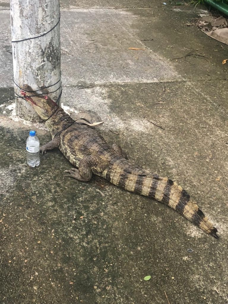 Um jacaré foi encontrado amarrado a um poste no Passeio do Mindu, bairro Parque Dez, zona Centro-Sul de Manaus, na manhã desta terça-feira (16).