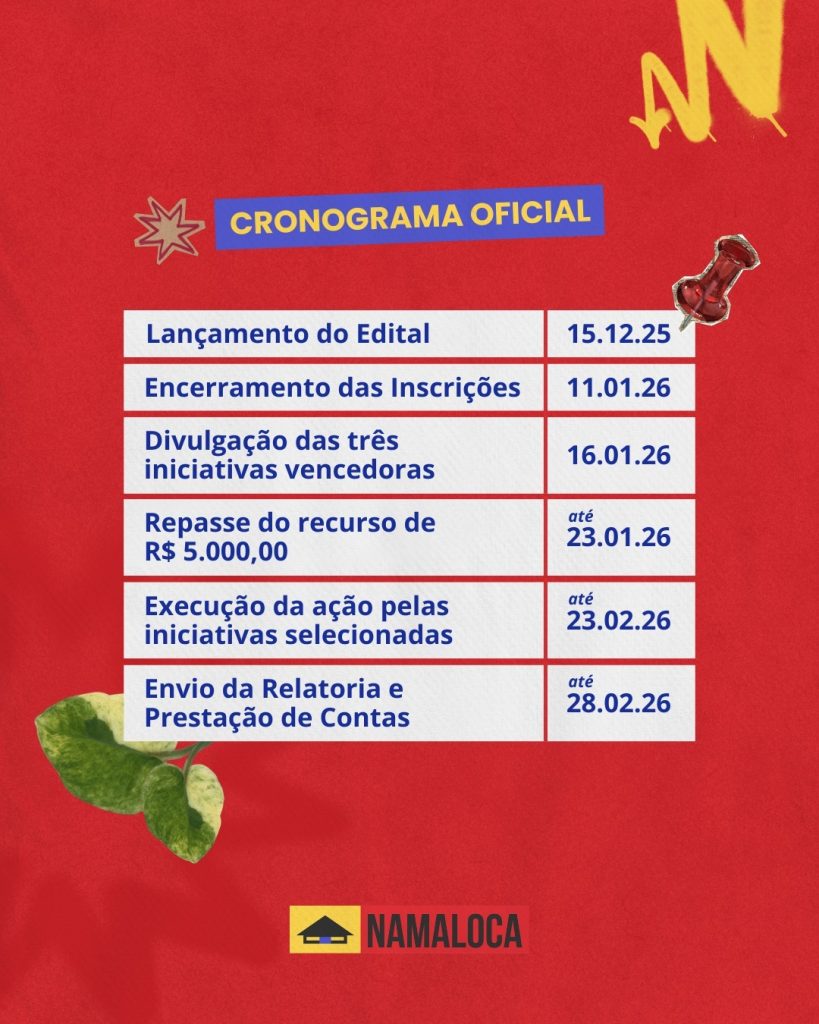 O resultado com as três iniciativas selecionadas será divulgado em 16 de janeiro de 2026. O repasse do recurso financeiro, no valor de R$ 5.000,00 para cada projeto, está previsto para ocorrer até 23 de janeiro de 2026.