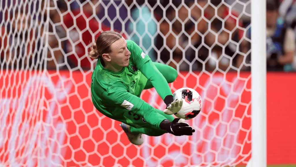 No segundo tempo da prorrogação, Nuno Mendes arriscou de fora da área e Rossi fez grande defesa, levando o mundial para os pênaltis.