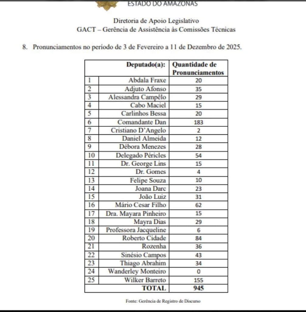 Entre 3 de fevereiro e 11 de dezembro de 2025, os deputados da Assembleia Legislativa do Amazonas (Aleam) registraram 945 pronunciamentos.