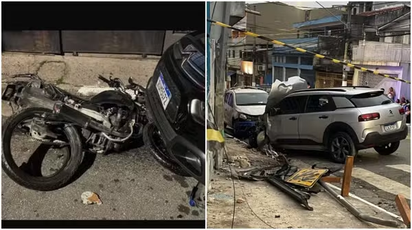 Além da moto, outros dois veículos — um Citroën C4 preto e um Gol branco — que estavam estacionados na rua também foram atingidos.