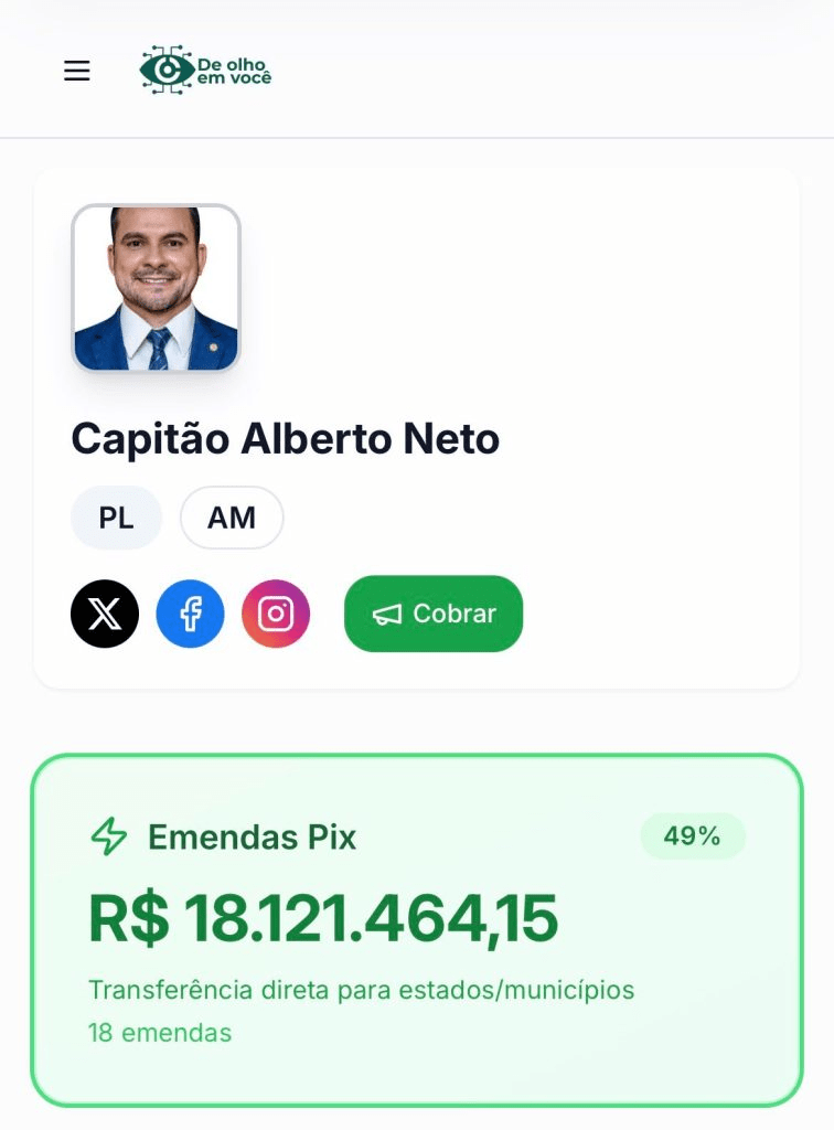 Um levantamento da plataforma De Olho em Você mostra que Alberto Neto lidera, entre os parlamentares da bancada do Amazonas, o volume de recursos encaminhados por meio desse tipo de emenda até o momento.