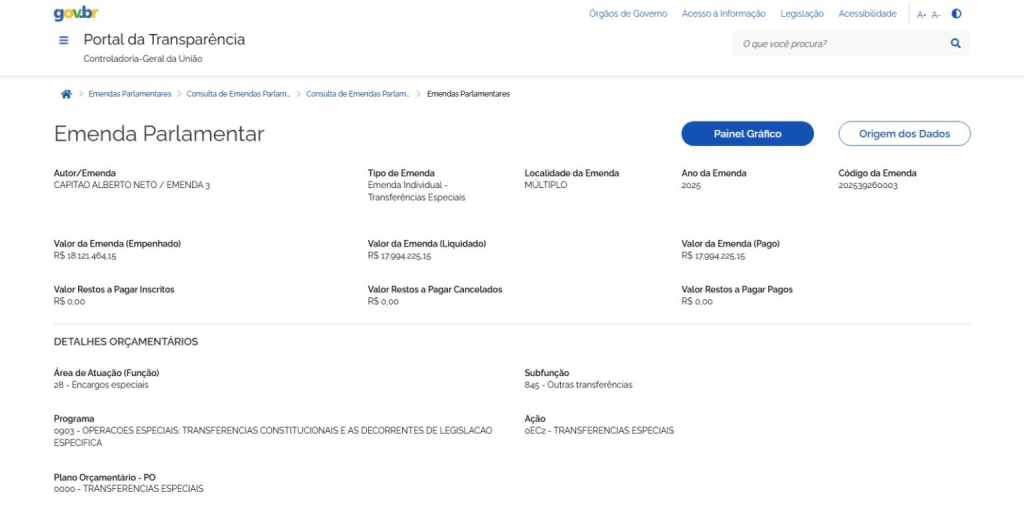 De acordo com dados do sistema de acompanhamento de emendas parlamentares, o deputado empenhou R$ 18.121.464,15 em emenda individual classificada como transferência especial.
