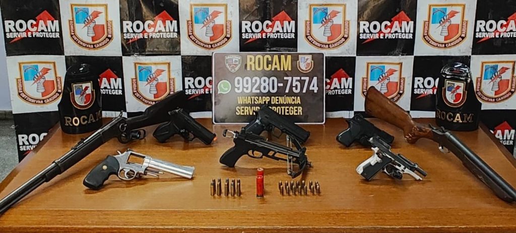 Durante as diligências no local, os policiais localizaram a vítima e apreenderam um revólver calibre 38, uma pistola calibre 380, um rifle calibre 38 e uma espingarda calibre 16, além de três simulacros de pistola.