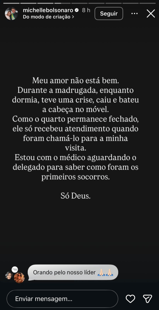 Ela afirmou que Bolsonaro teria passado por uma crise enquanto dormia, caiu e bateu a cabeça em um móvel da cela, sendo atendido apenas horas depois, quando foi chamado para a visita. “Meu amor não está bem”, escreveu.