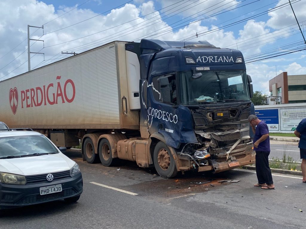 Um engavetamento envolvendo duas carretas e três veículos de passeio causou lentidão no trânsito na manhã desta quinta-feira (8), na avenida Torquato Tapajós, em frente à empresa Coca-Cola, na Zona Norte de Manaus.