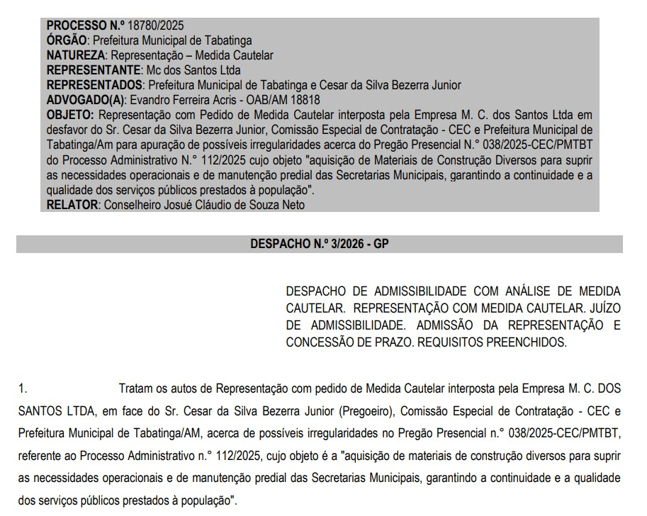 O Tribunal de Contas do Estado do Amazonas (TCE-AM) recebeu uma representação com pedido de medida cautelar que aponta possíveis irregularidades em um pregão presencial promovido pela Prefeitura de Tabatinga, sob a administração de Plínio Cruz.